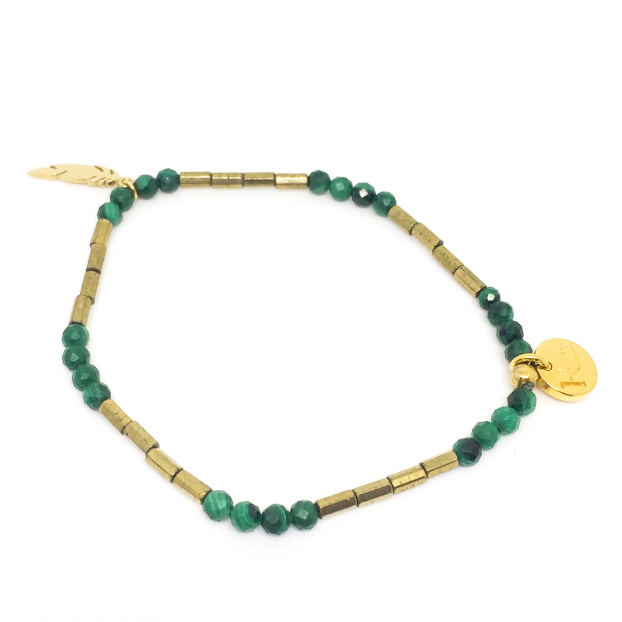 Bracelet en malachite et hématique 3mm, breloque plume plaqué or.