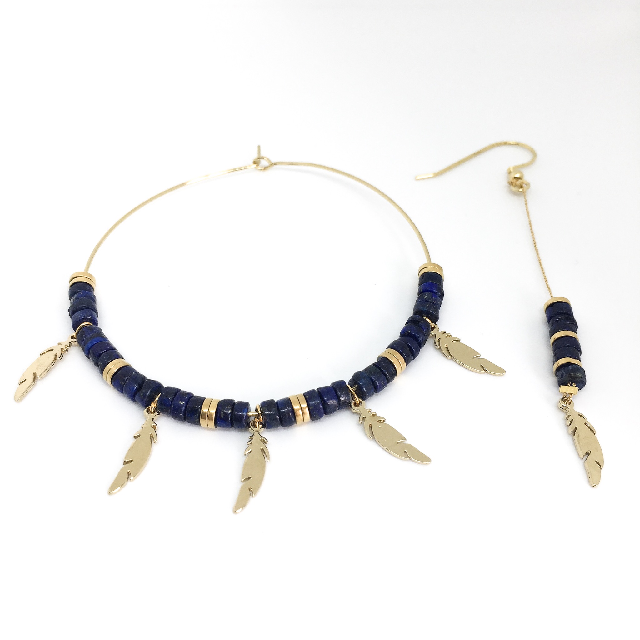 Boucles d’oreille or asymétriques, en heishi lapis lazuli avec plume.