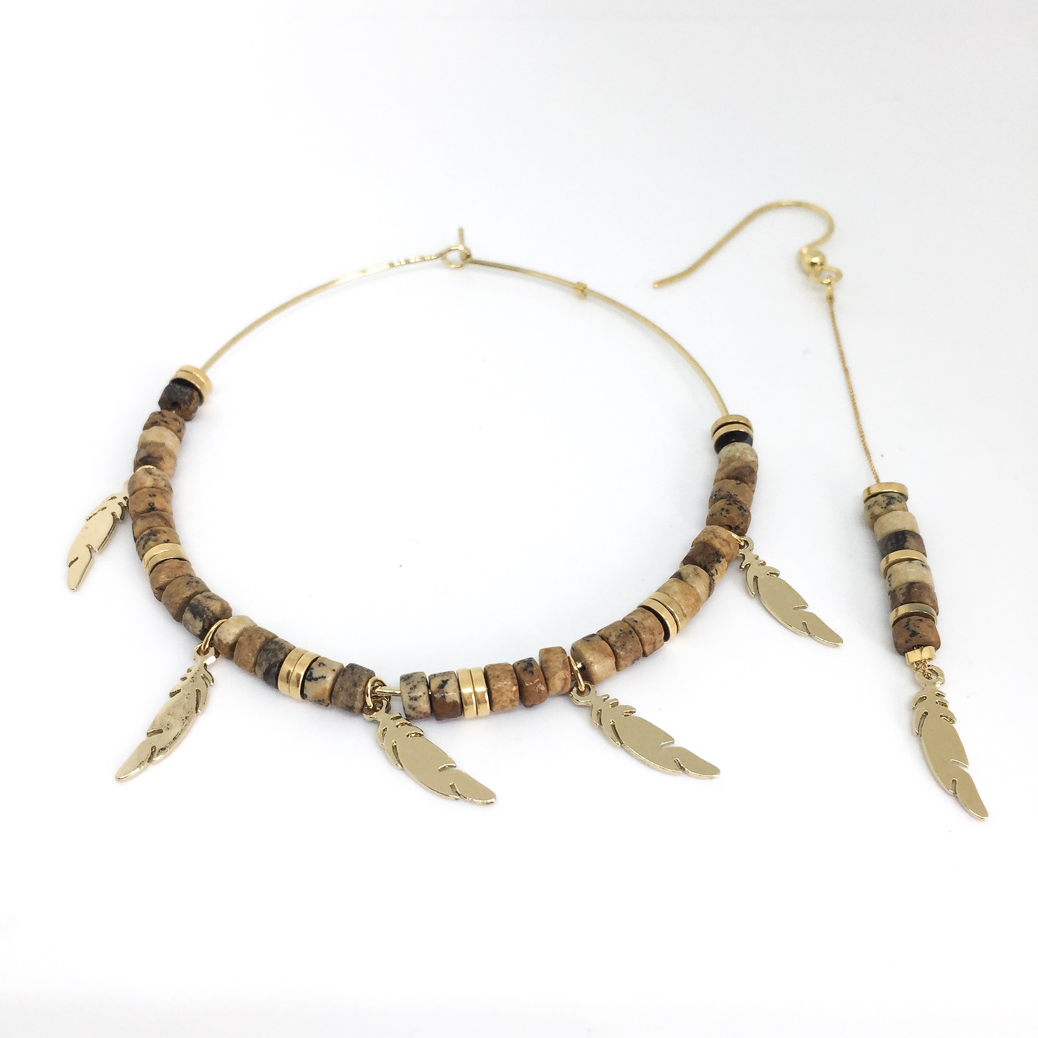 Boucles d’oreille or asymétrique, en heishi jaspe paysagé avec plume.