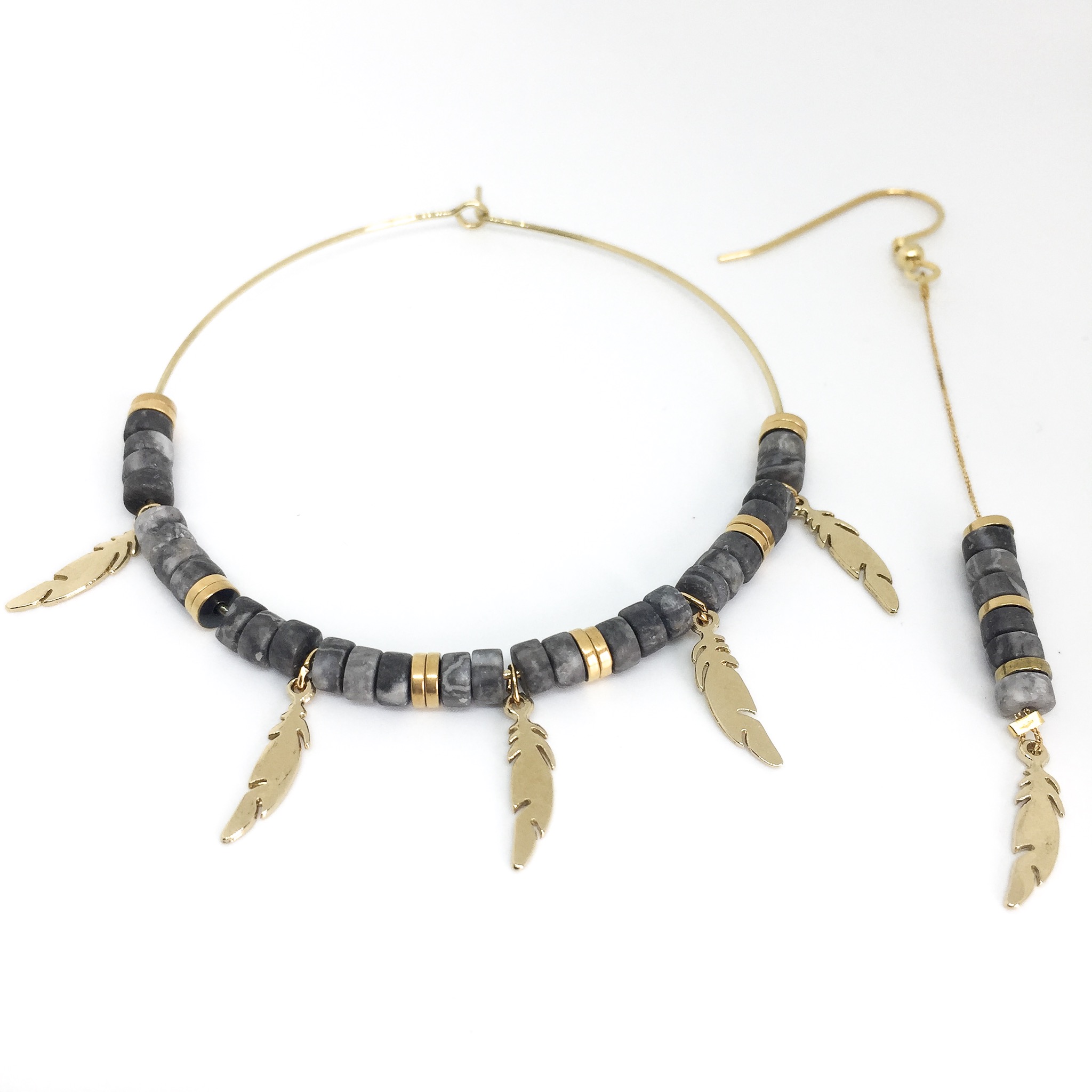 Boucles d’oreille or asymétriques, en heishi jaspe picasso avec plume.