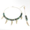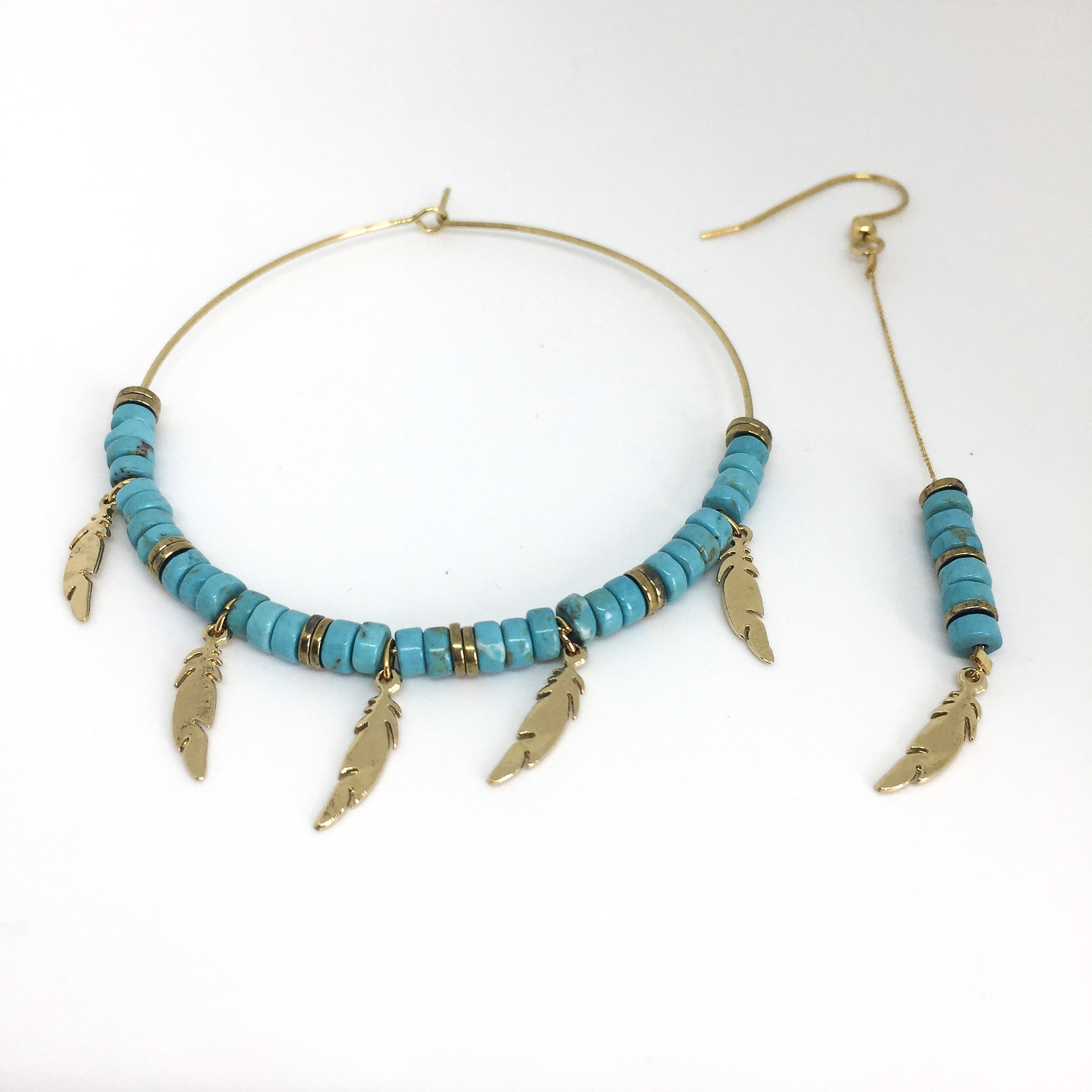 Boucles d’oreille or asymétriques, en heishi magnésite turquoise avec plume.