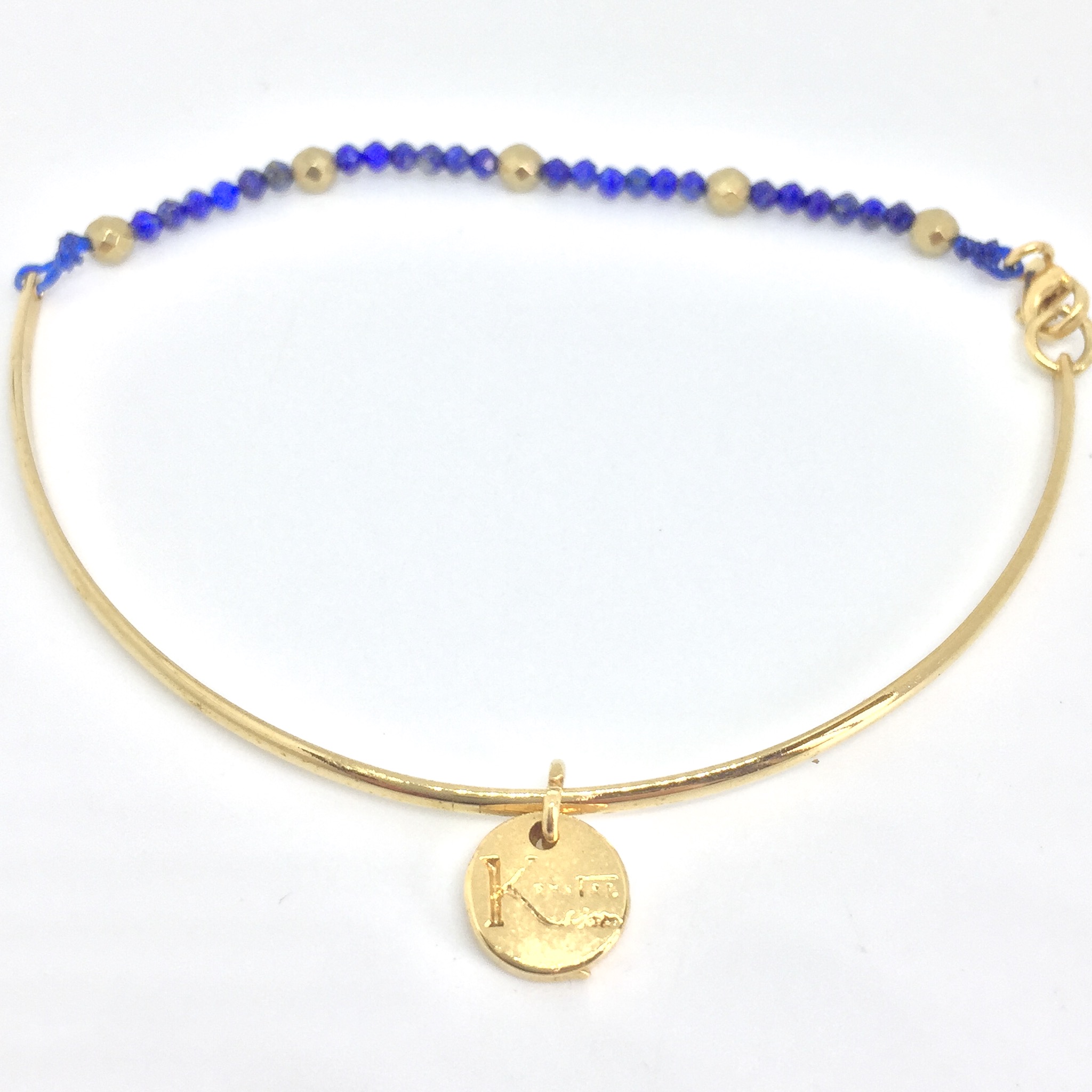 Bracelet jonc en plaqué or, avec hématite or et lapis lazuli.