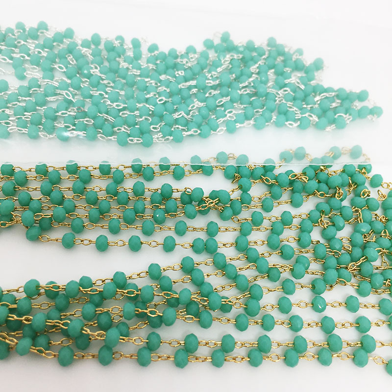 Chaine avec perles de verre 3mm bleu lagon plaqué or et plaqué argent