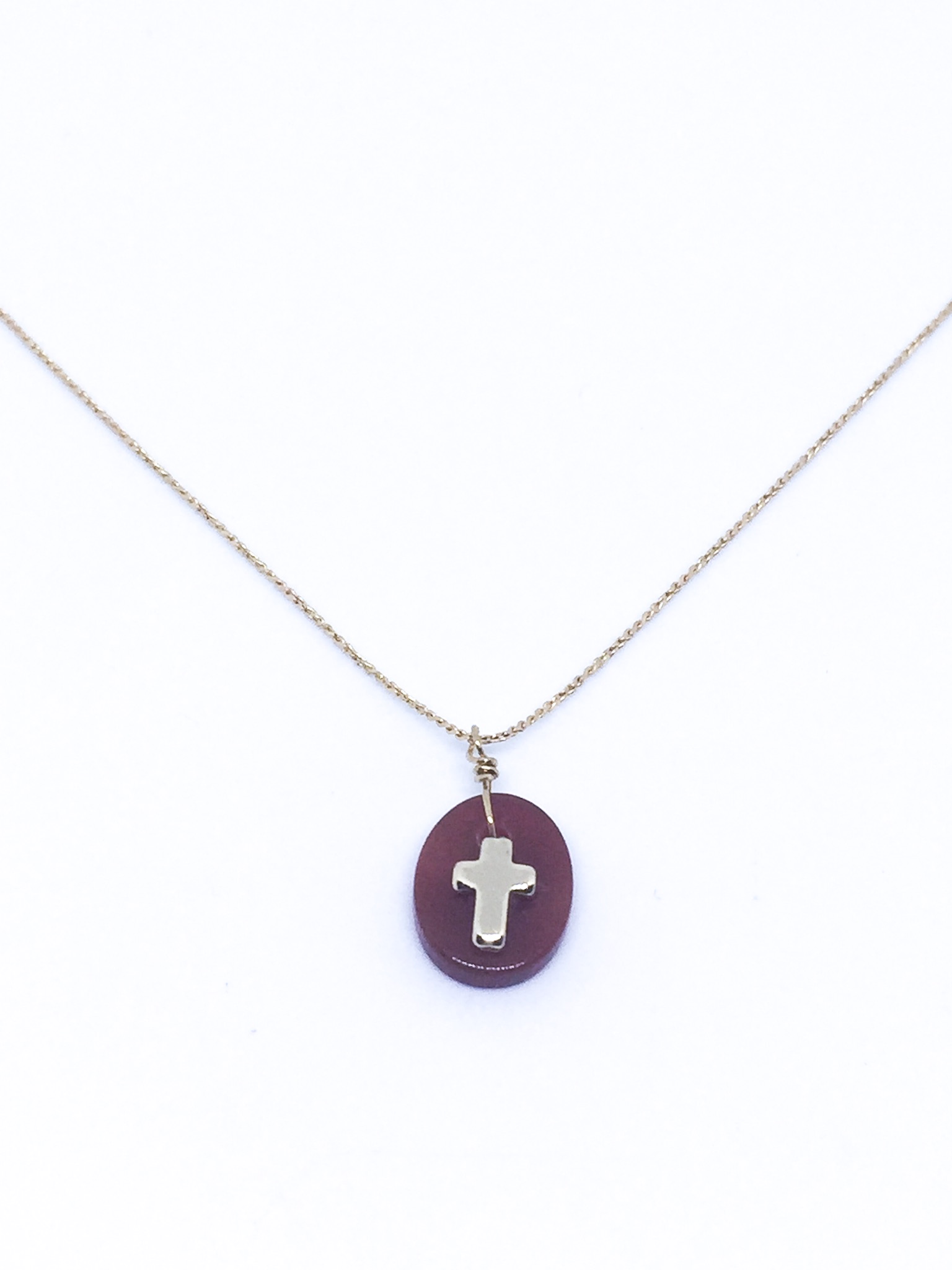 Collier or, pastille en cornaline avec croix.