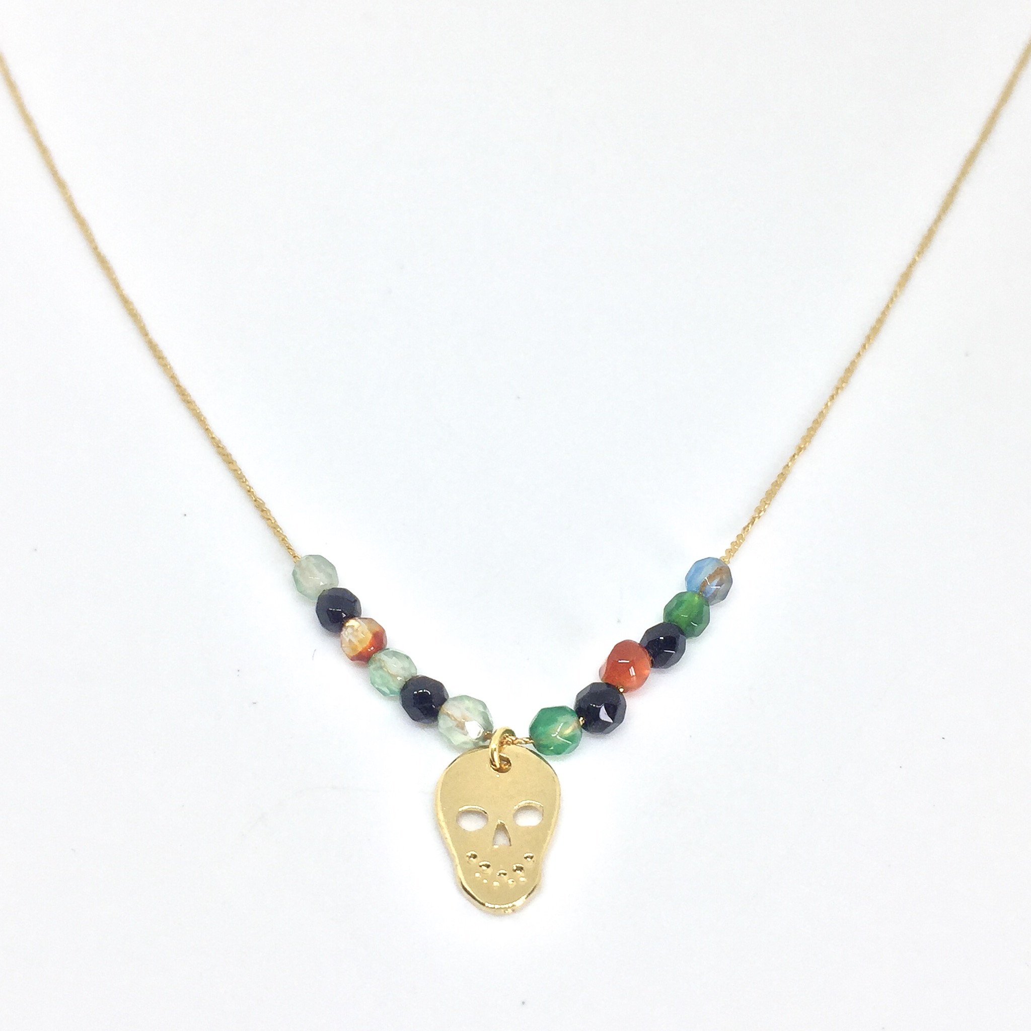 Collier or, avec agate multicolore 3mm et tête de mort.