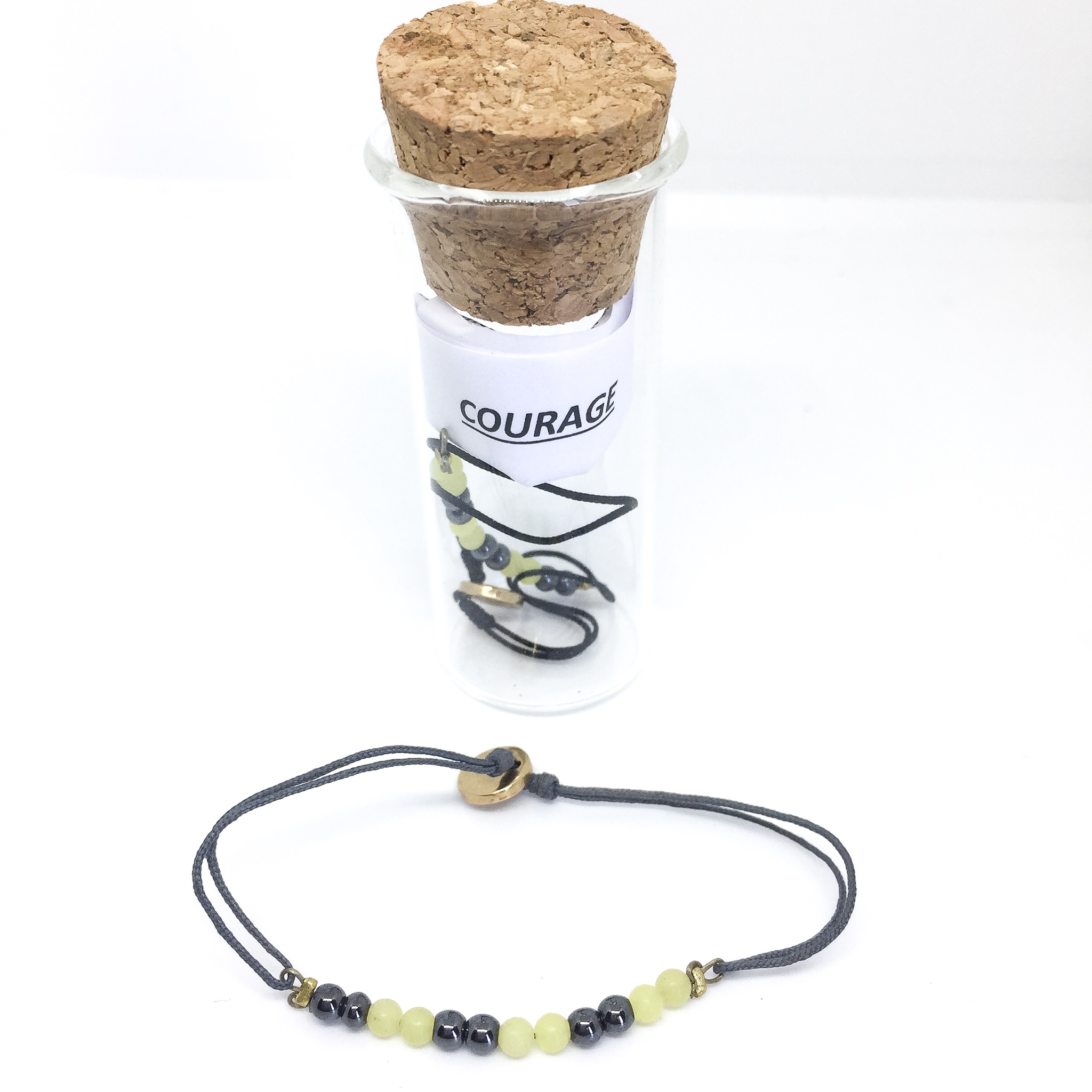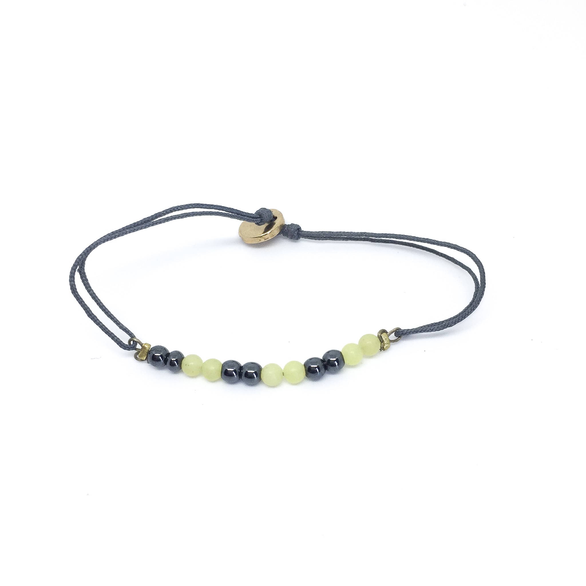 Ce bracelet est un bijou de lithothérapie, réglable grâce à ses nœuds coulissants.