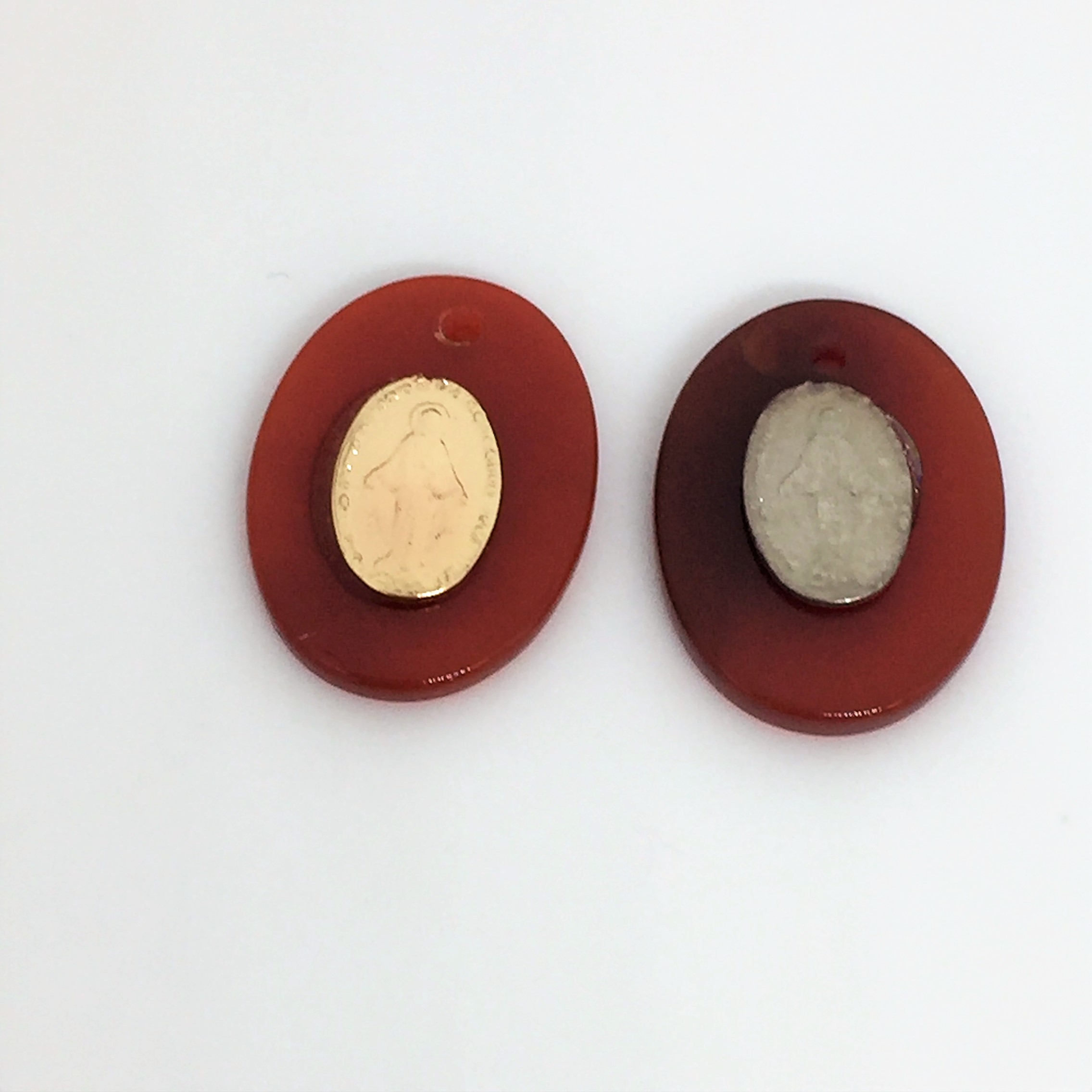 Pastille en cornaline avec vierge or ou argent, 2 tailles, 1 ou 2 trous.