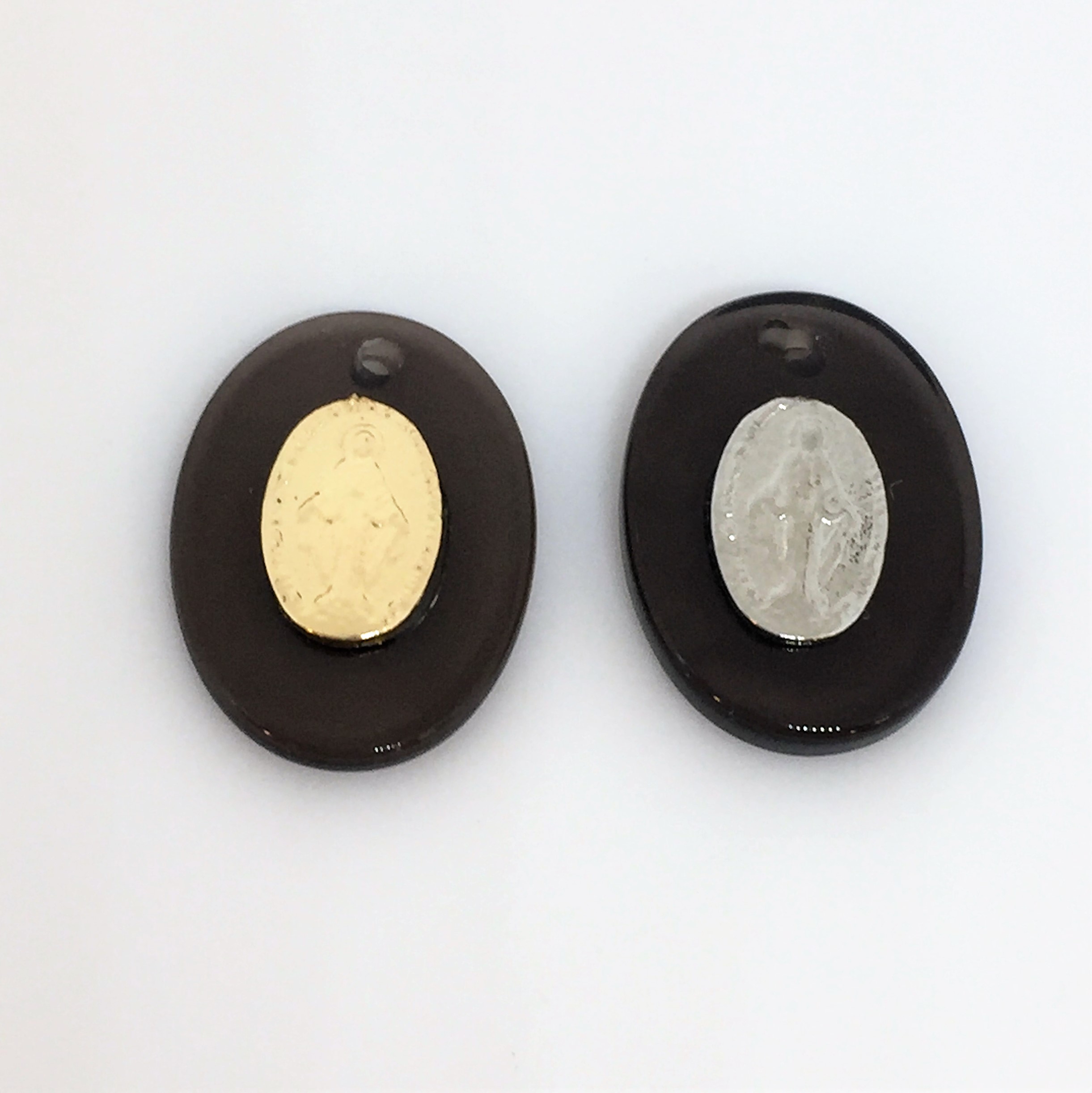 Pastille en quartz fumé avec vierge or ou argent, 2 tailles, 1 ou 2 trous.